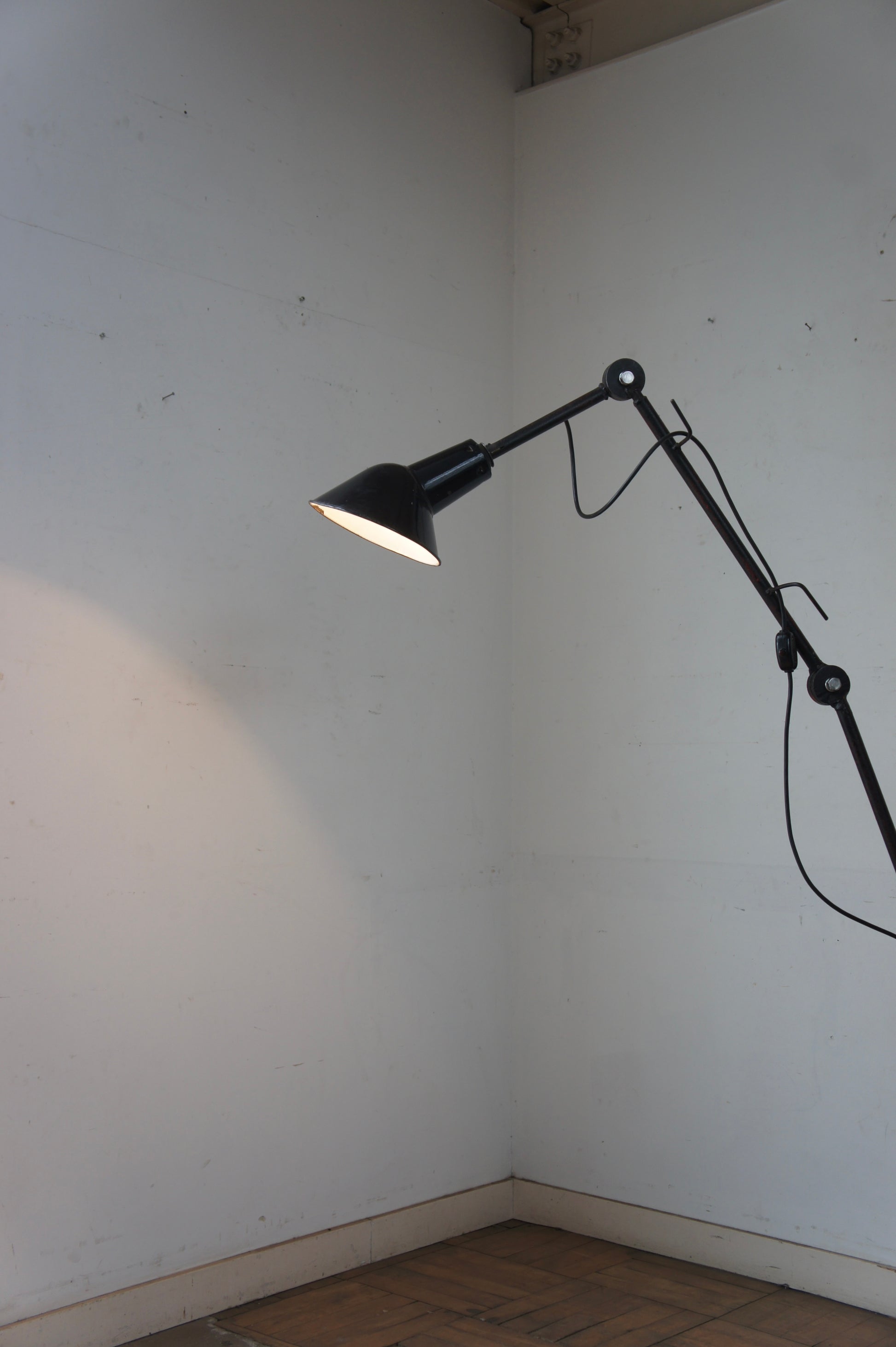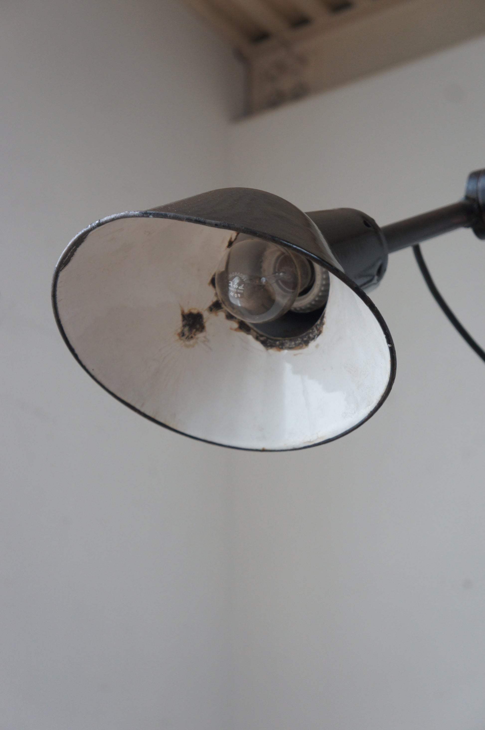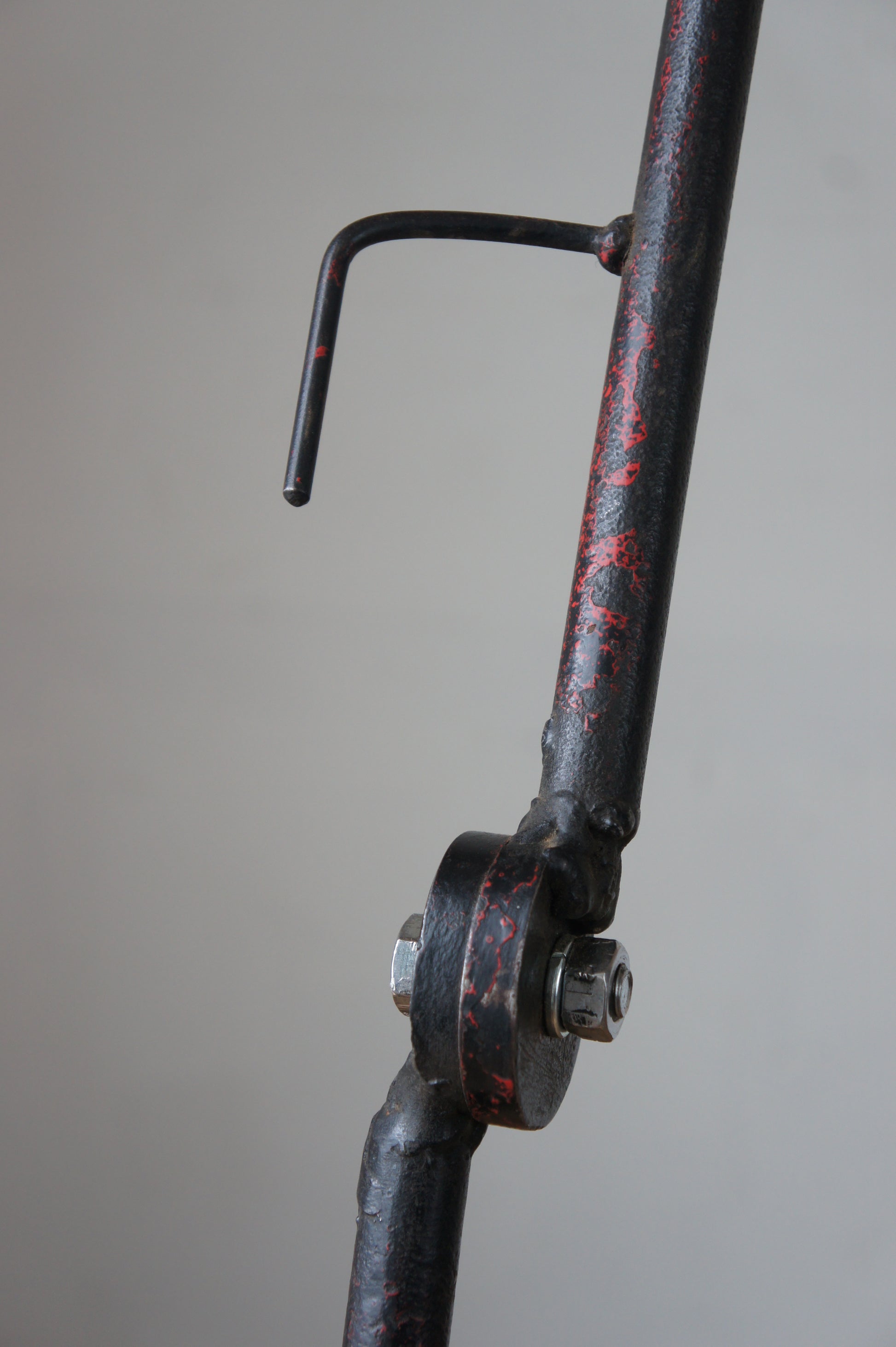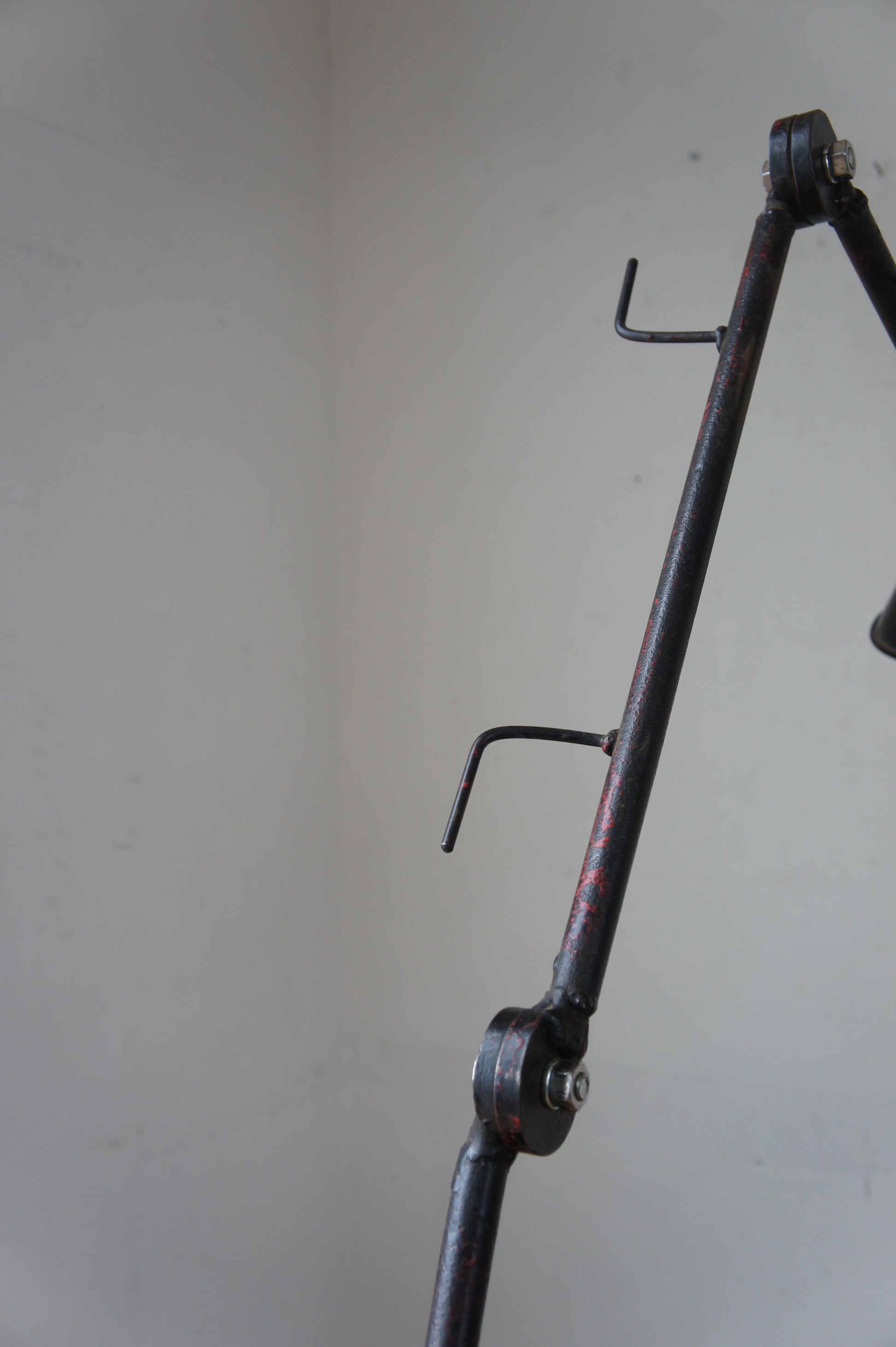 フランス製、年代不詳、おそらく工房で手作りされたとみられる4本アームのスタンドライト。簡素なパーツを組み合わせ、力強く溶接された生々しさがあり、赤いペイントの残る鉄製ボディが味わい深い印象を放ちます。コードをまとめるフックも設けられ、実用的な工夫が感じられます。ブラックエナメルのシェードと、ベークライト製の古い中間スイッチも当時の雰囲気を残しています。