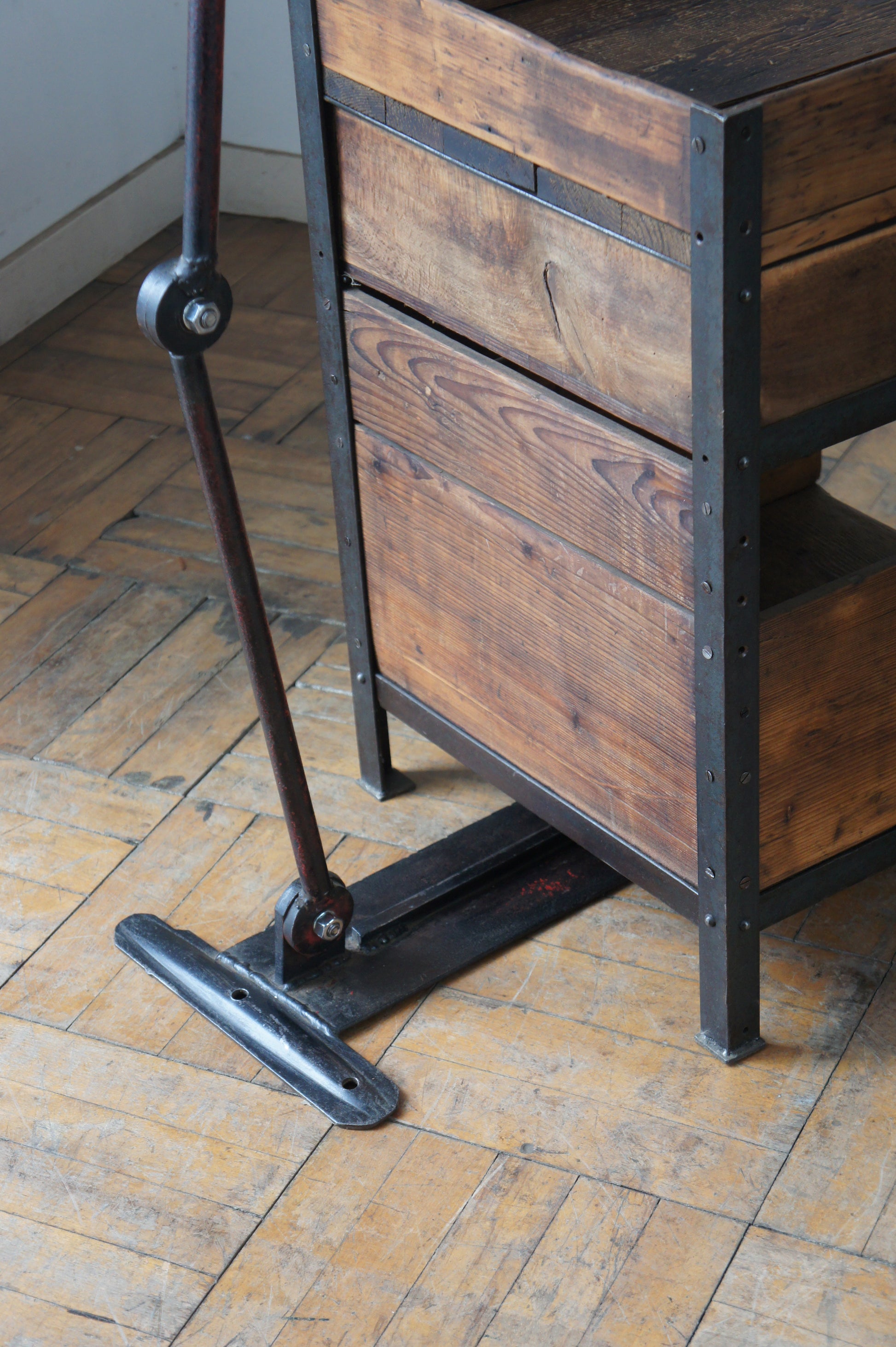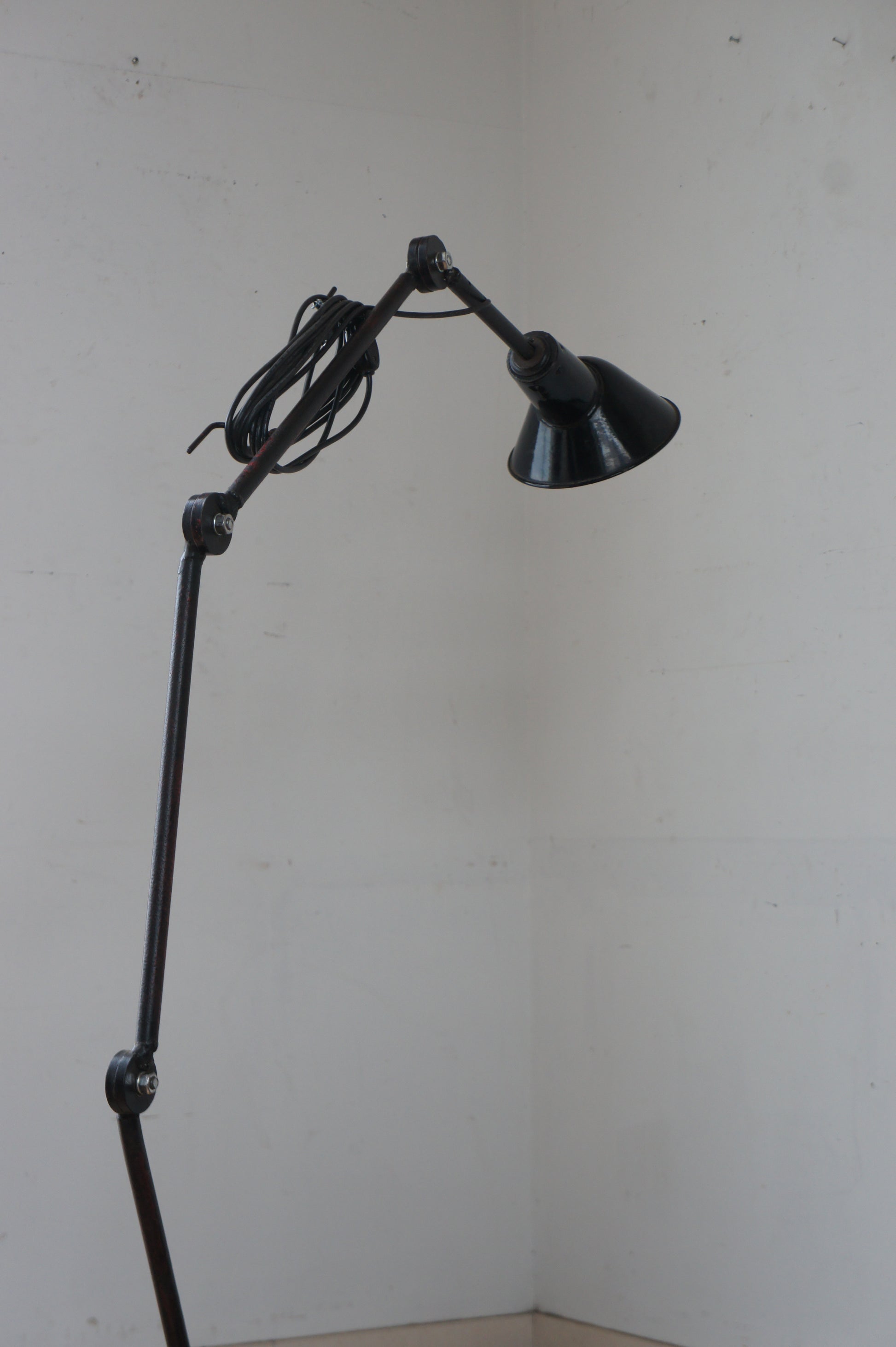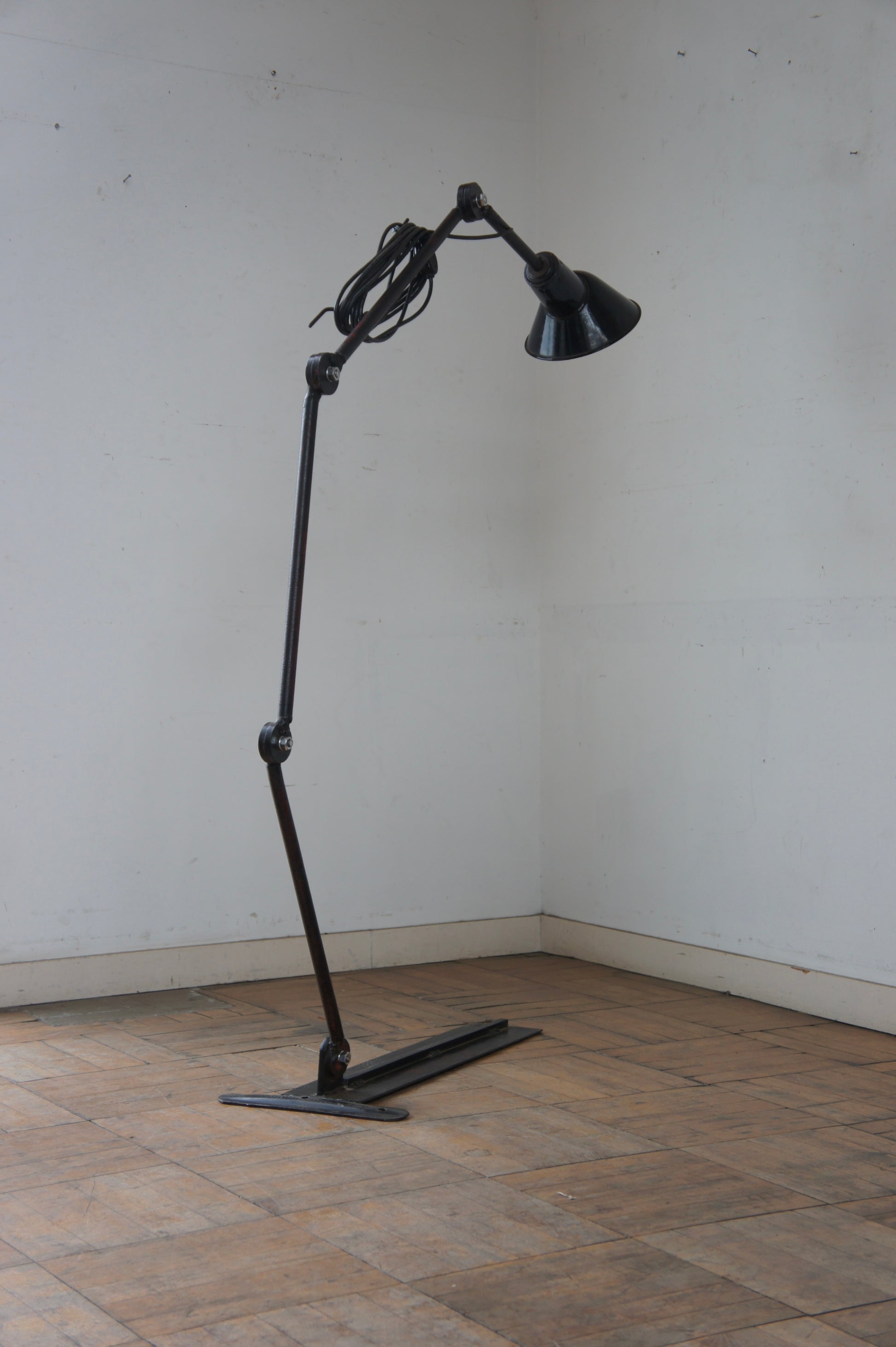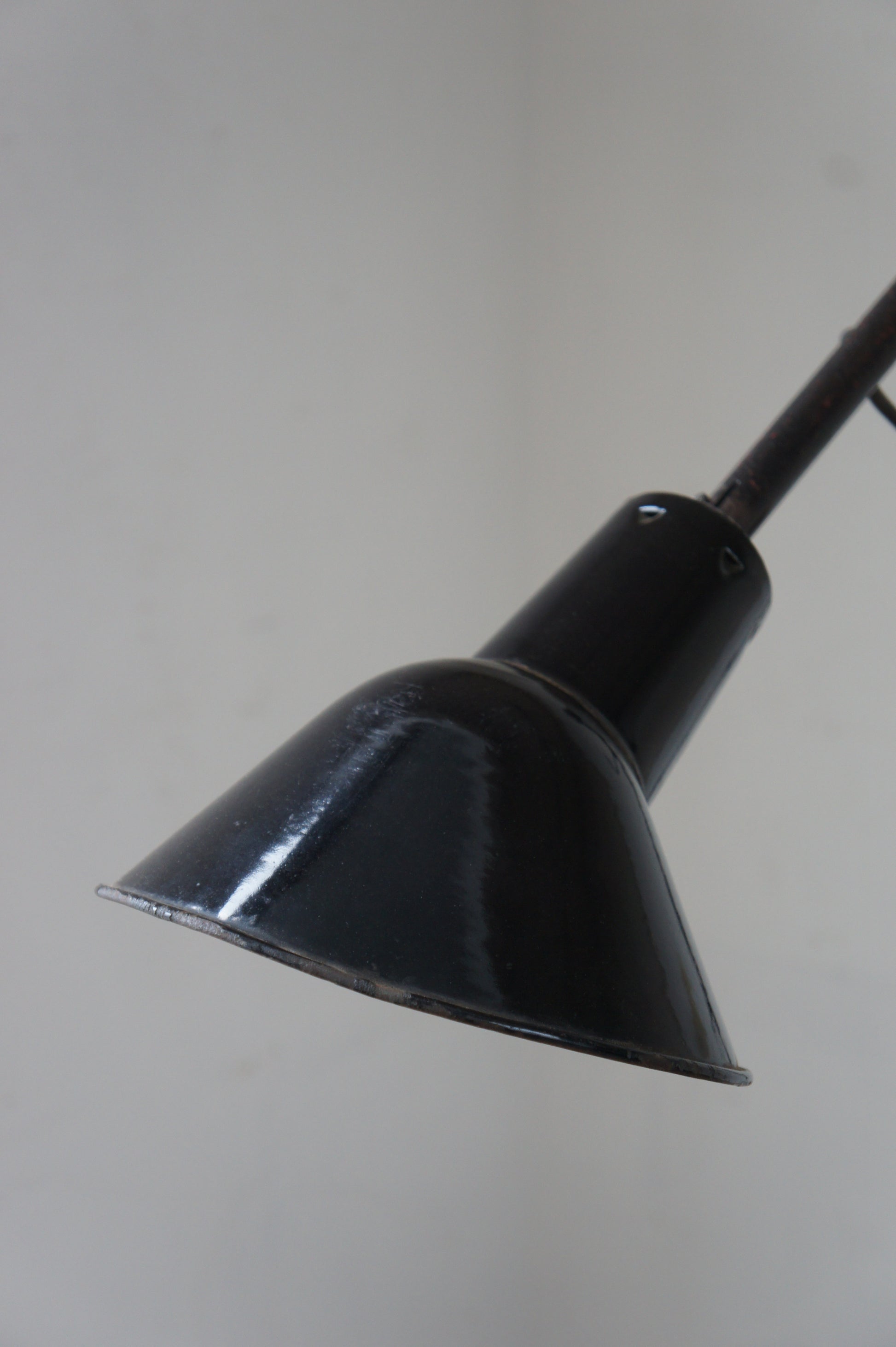 フランス製、年代不詳、おそらく工房で手作りされたとみられる4本アームのスタンドライト。簡素なパーツを組み合わせ、力強く溶接された生々しさがあり、赤いペイントの残る鉄製ボディが味わい深い印象を放ちます。コードをまとめるフックも設けられ、実用的な工夫が感じられます。ブラックエナメルのシェードと、ベークライト製の古い中間スイッチも当時の雰囲気を残しています。