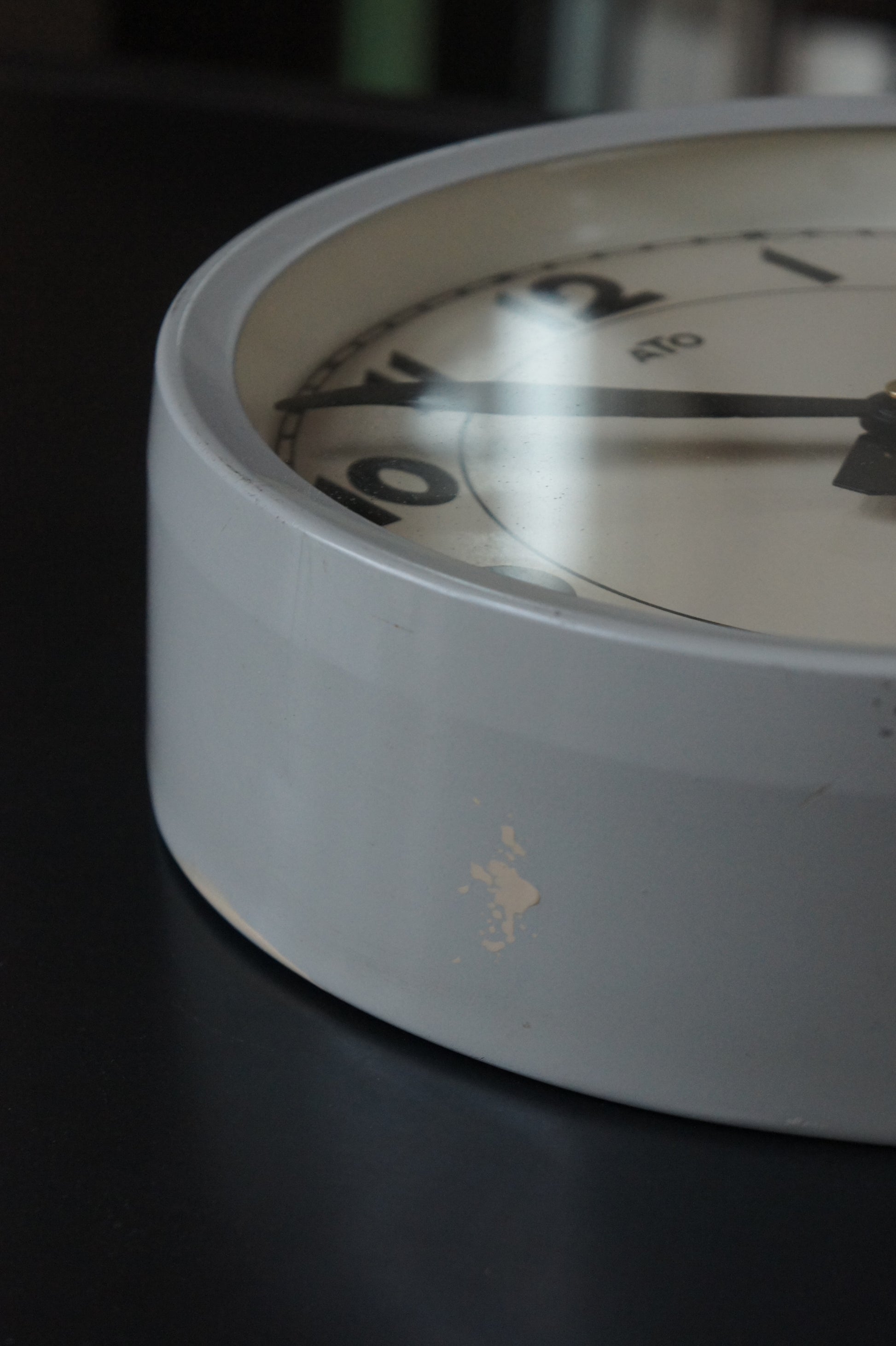 1950〜60年代頃のモデルで、すっきりとしたライトグレーのボディと、ATOらしい柔らかな書体のフォントが特徴です。当時のモダンデザインの空気をそのまま宿しています。実用的でありながら、確かな存在感を放つ一品です。モダンなリビングやワークスペースはもちろん、カフェや店舗空間にも自然に溶け込みます。