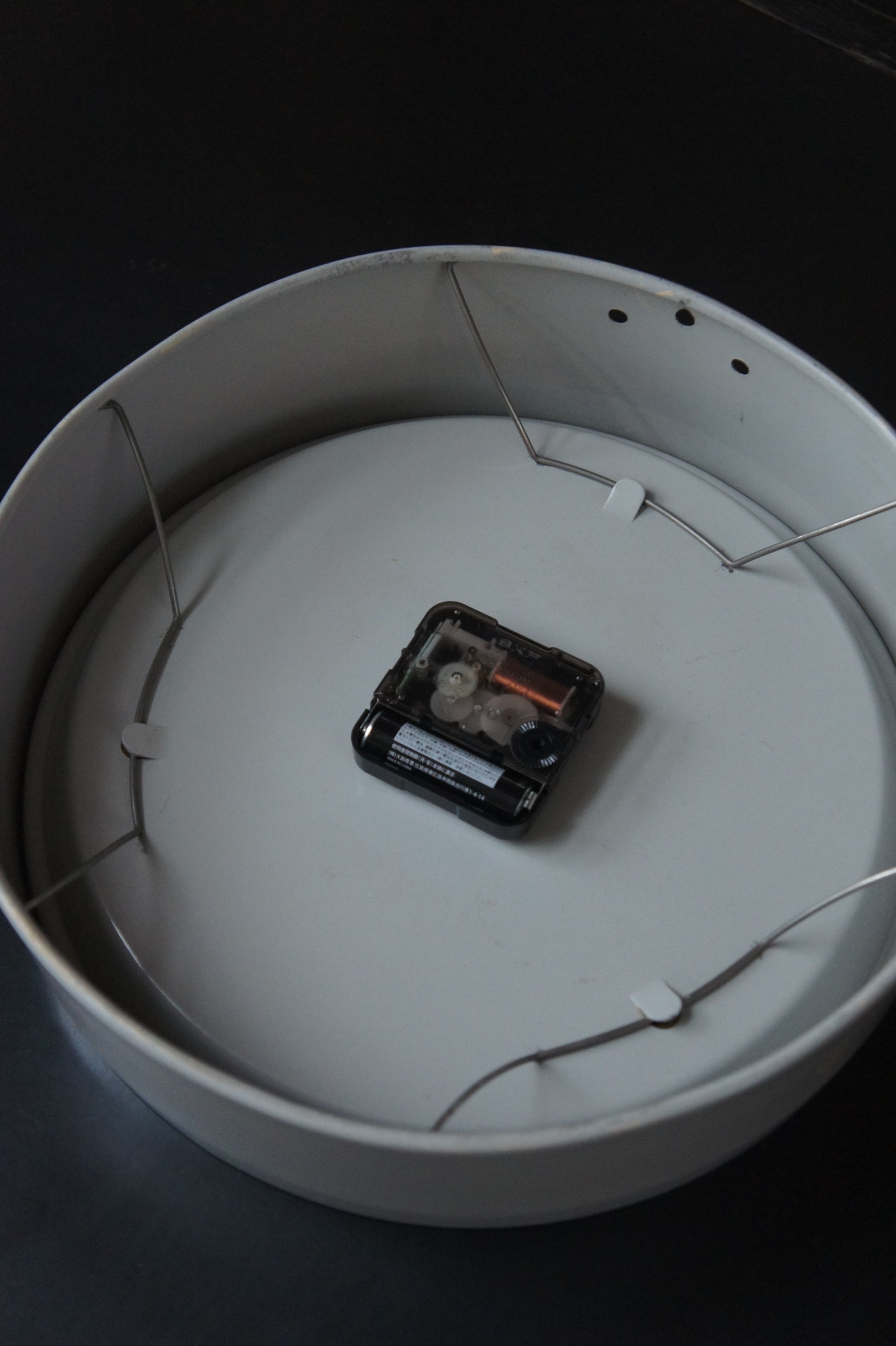 当時のライトグレー塗装をそのまま残し、ヴィンテージらしい使用感が感じられます。フレームにはわずかな凹みや歪み、擦れ、小さな塗料の付着などがありますが、文字盤や針はきれいな状態を保っています。針はオリジナルを加工し、ムーブメントはクォーツ式に交換済み。当時の雰囲気を保ちながらも、日常で安心してご使用いただけます。