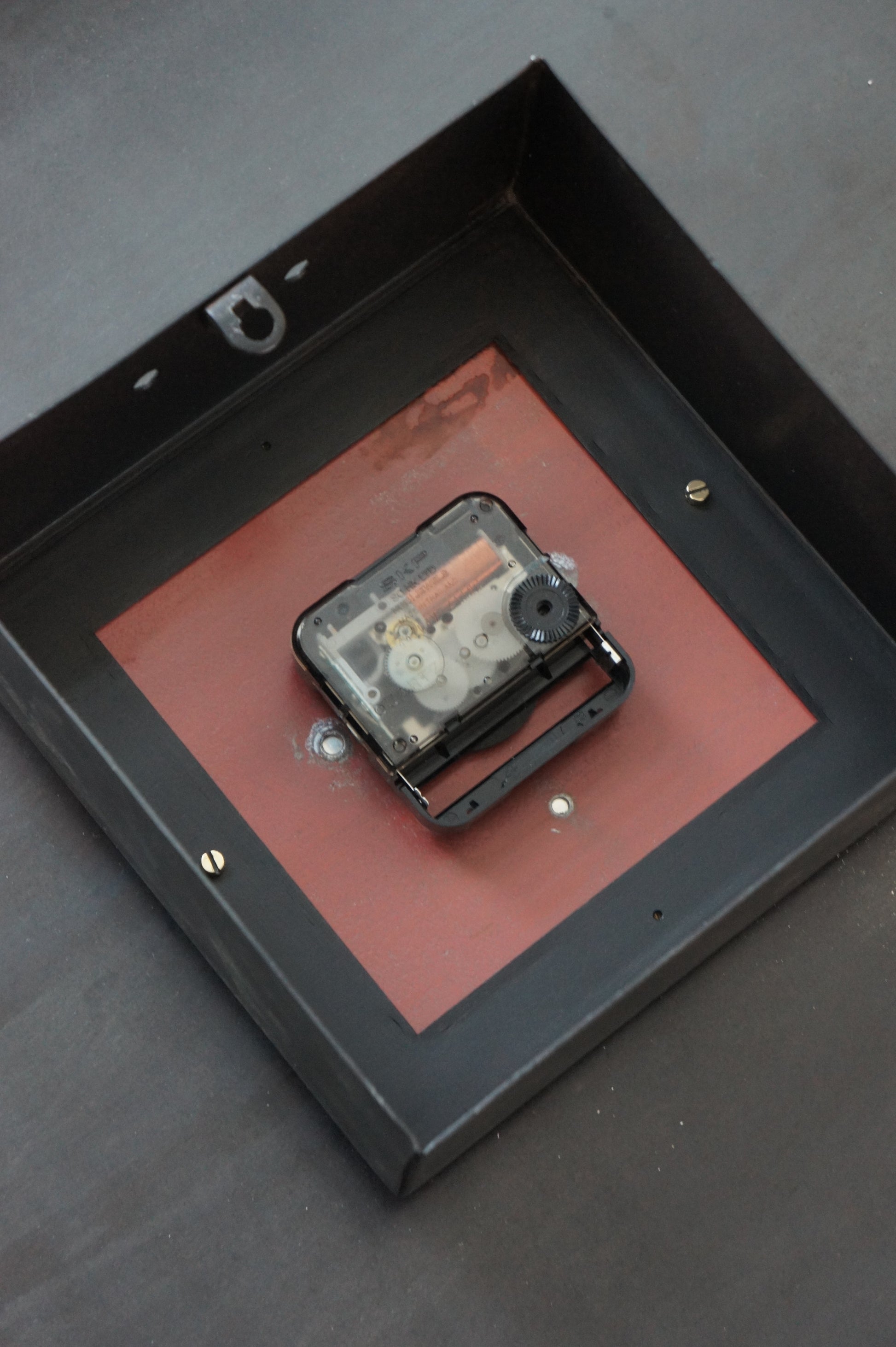 ボディは古い塗装を剥離後、鉄素地から黒染め加工を施し、オイルコーティングにて仕上げています。ムーブメントはオリジナルの針を加工のうえクォーツ式へ交換済み。単三電池1本で実用的にご使用いただけます。卓上使用の際は、前方に重心があるため、重石などでの調整をおすすめします。