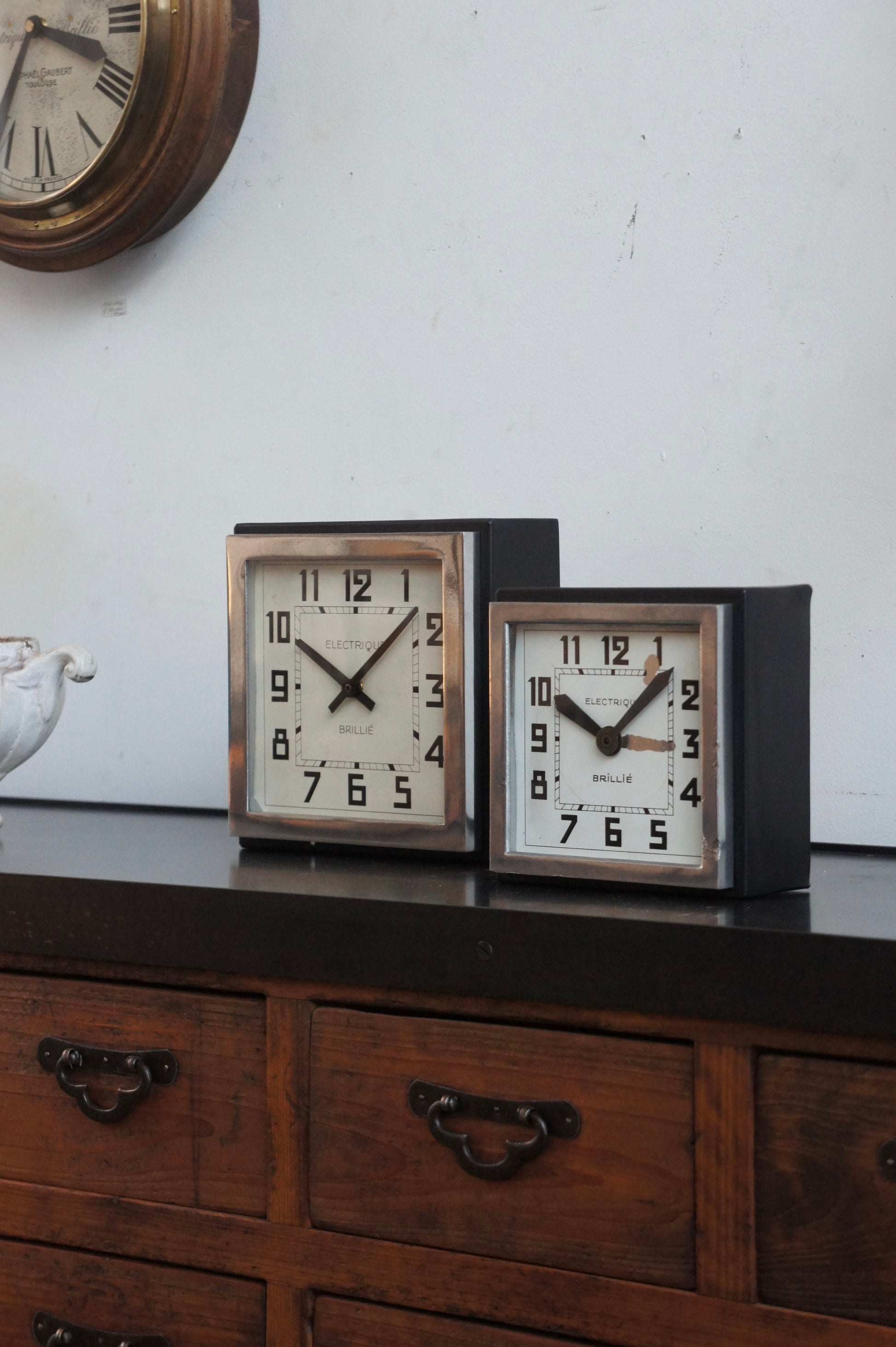 同社のスクエアモデルの中でも、ひときわ小さなサイズ感が魅力の希少な一台です。正方形の鉄製ボディに、シルバーに磨き込まれたメッキフレームを組み合わせた構成は、他モデルと同様ながら、このサイズになることで印象はより軽やかで親密なものに。黒染めされた鉄のマットな質感と、艶を帯びたメッキフレームのコントラストが際立ち、小さいながらもBrilliéらしい端正な存在感をしっかりと感じさせます。文字盤には、アールデコを思わせる幾何学的なフォントと「ELECTORIQUE BRILLIÉ」のロゴが入り、フランスヴィンテージらしい洗練された表情。小ぶりでありながら、デザインの密度は決して薄まらず、むしろ凝縮された美しさが際立ちます。