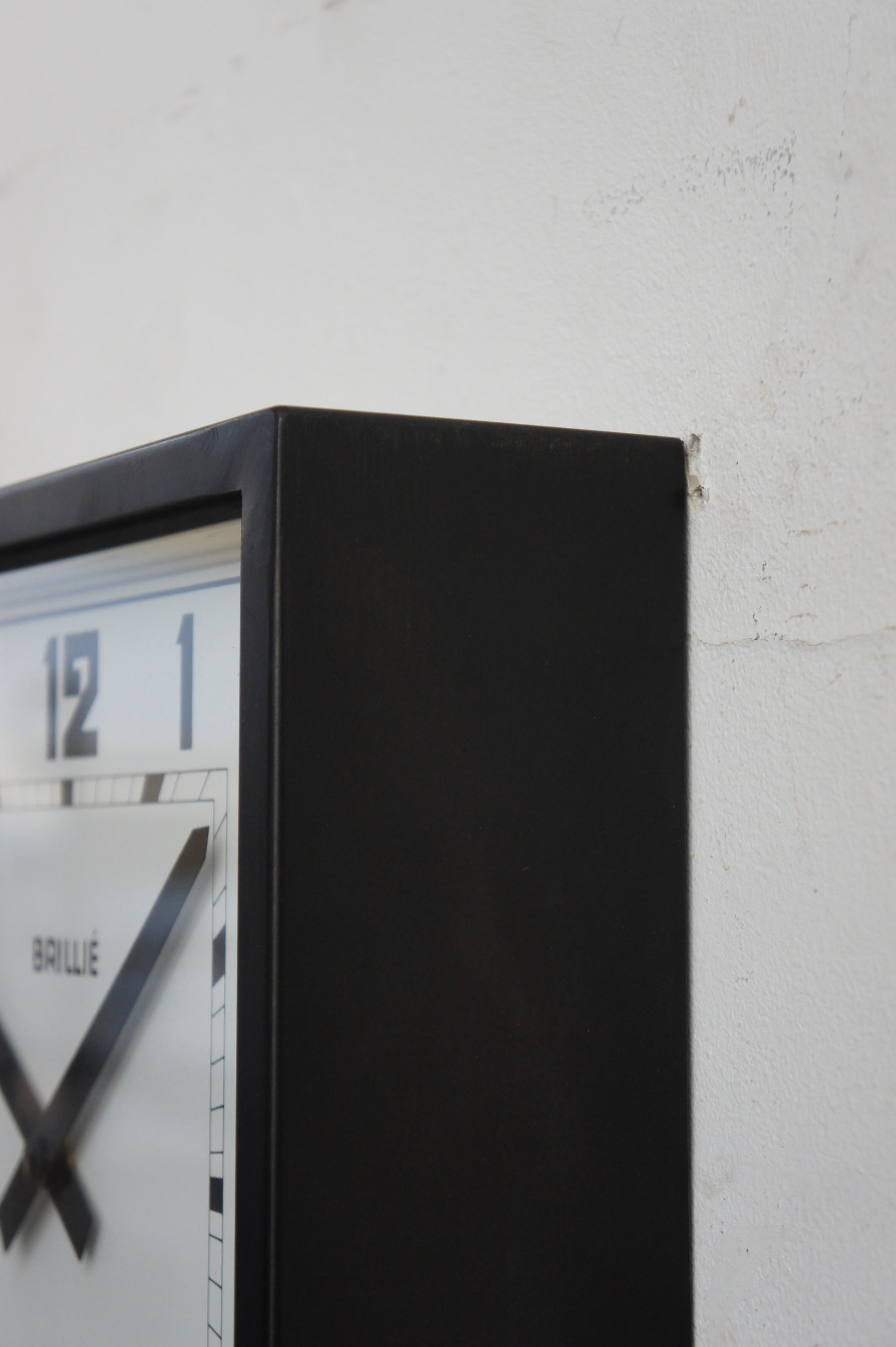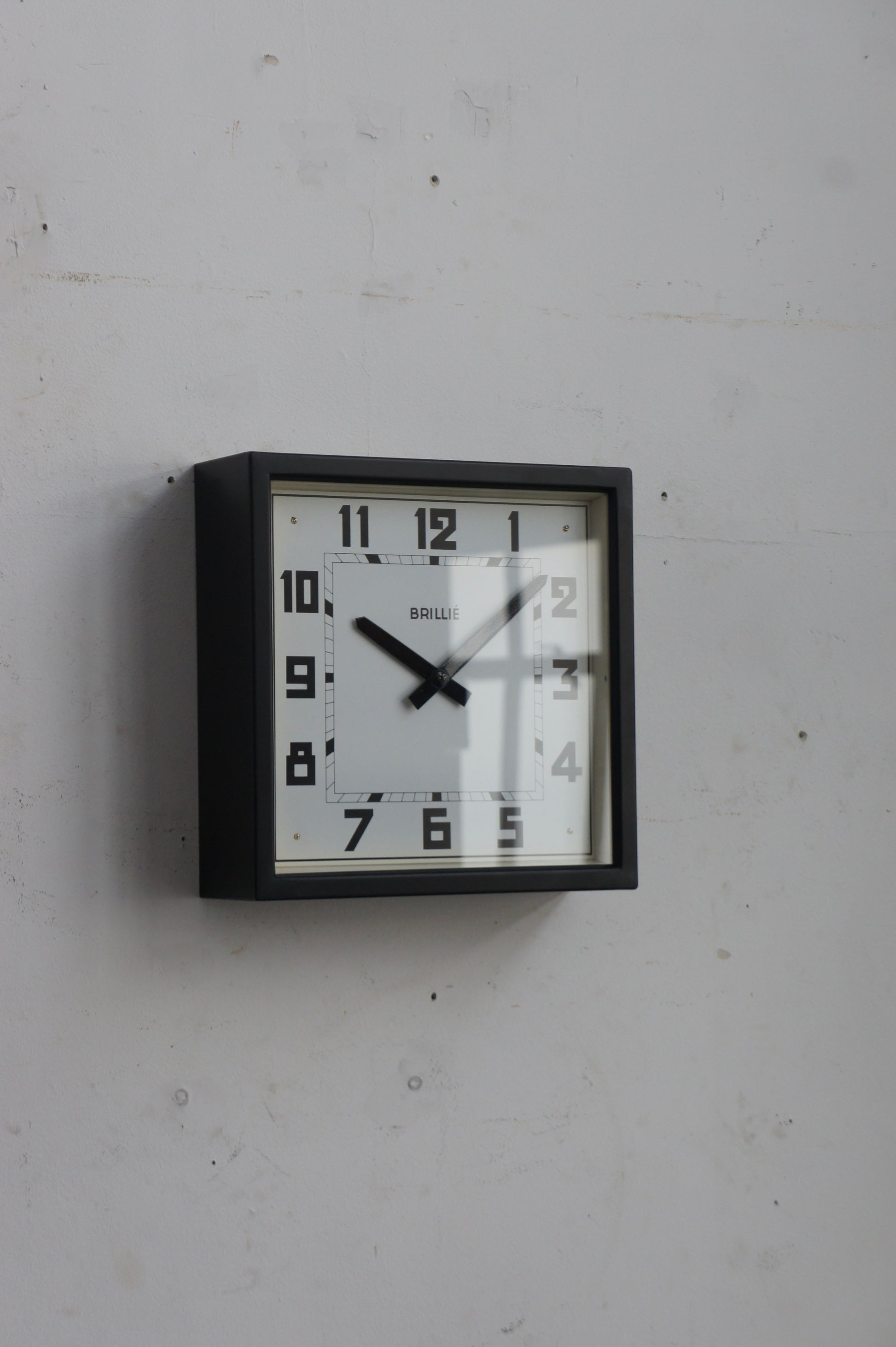 1940〜50年代頃、フランス・Brillié(ブリエ)社製のスクエア型ウォールクロック。正方形の鉄製フレームに、アールデコの趣を感じさせるデザイン性の高い文字盤を備えたモデルです。