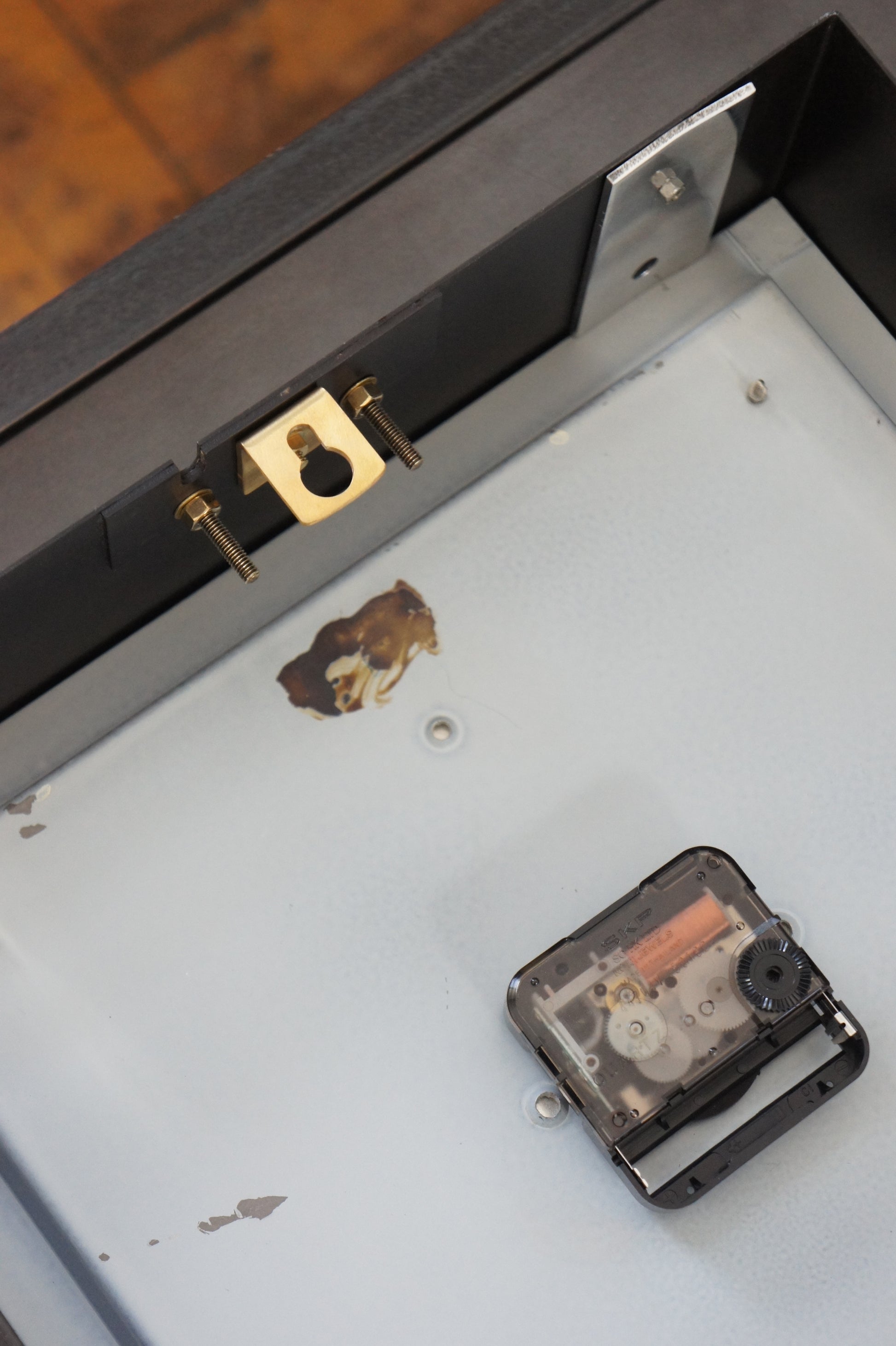 四角い構成美、視認性の高いデザイン、そして保存状態の良さが揃った、完成度の高い希少な一品です。ムーブメントはオリジナルの針を活かしつつ、クォーツ式へ交換済み。単三電池1本で実用的にお使いいただけます。卓上置きも可能ですが、前方に重心があるため、設置の際は重石などで安定させてください。
