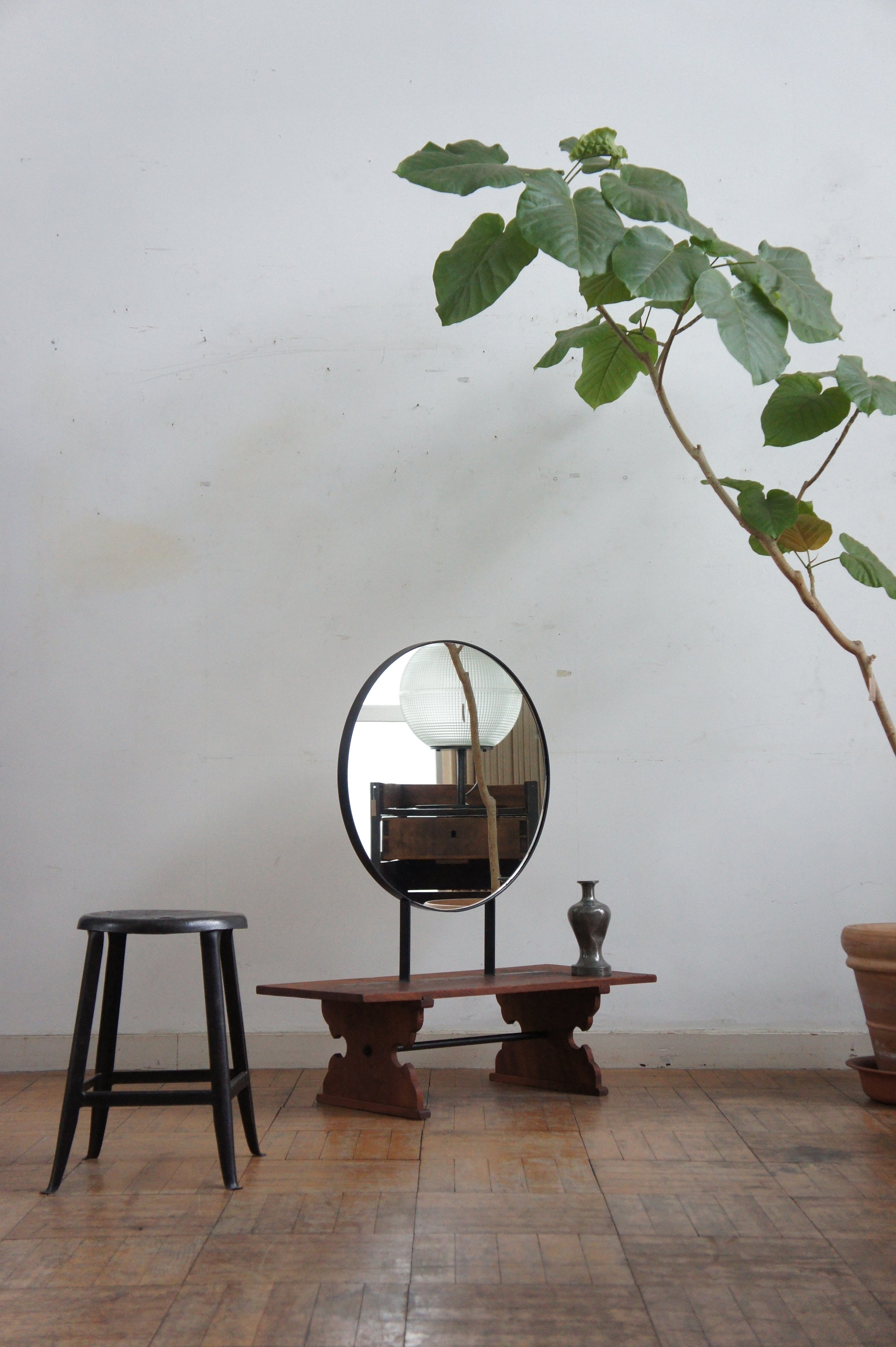 もともとは床座の生活に寄り添う、低く静かな佇まいの文机。そこに鉄製のフレームで支えた円形のミラーを据えることで、用途と時代を越えた家具へと生まれ変わりました。古木ならではの柔らかな表情と、黒皮鉄の持つ緊張感。異なる素材がぶつかるのではなく、互いを引き立て合いながら、空間に静かな存在感を生み出しています。