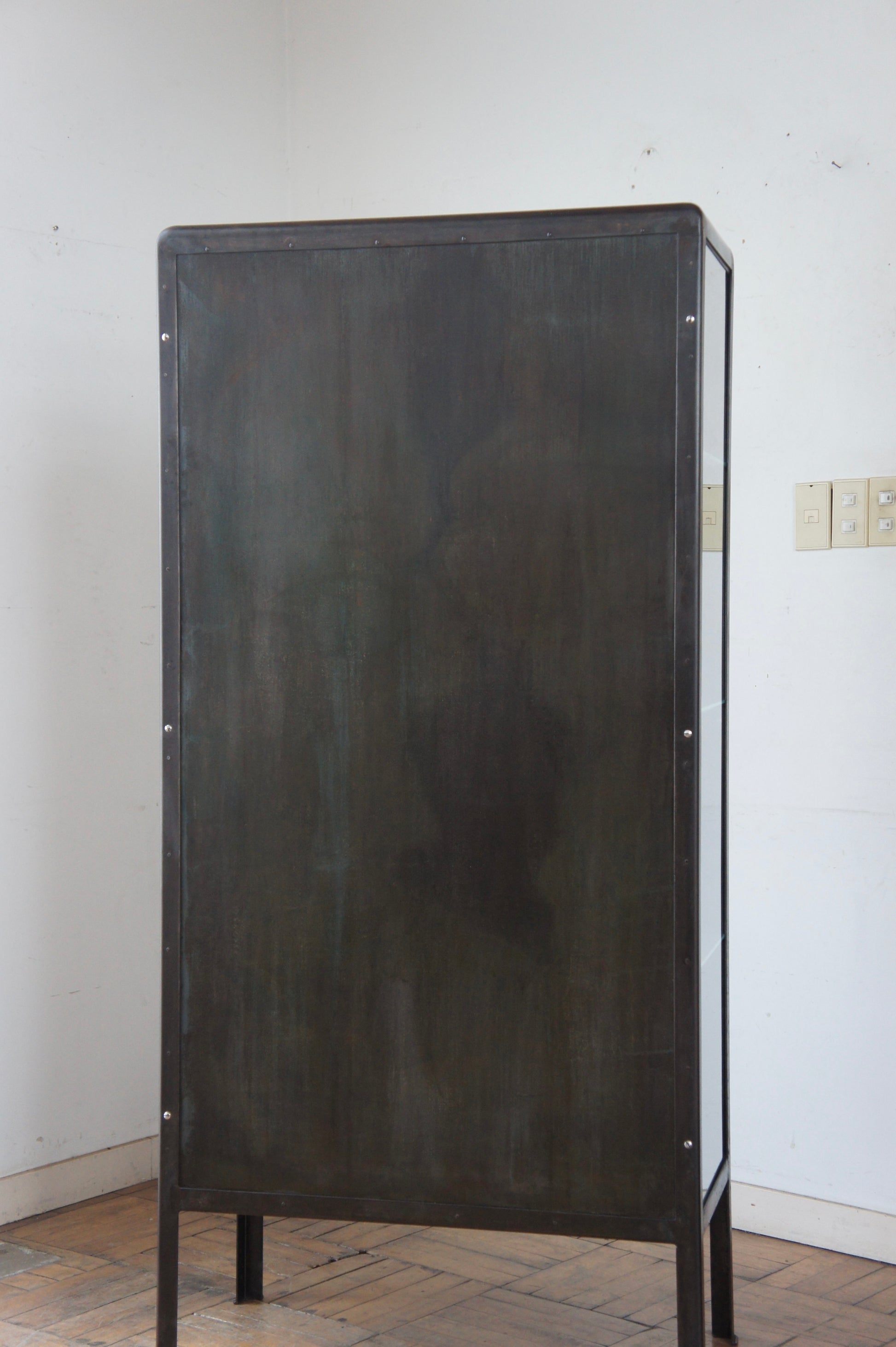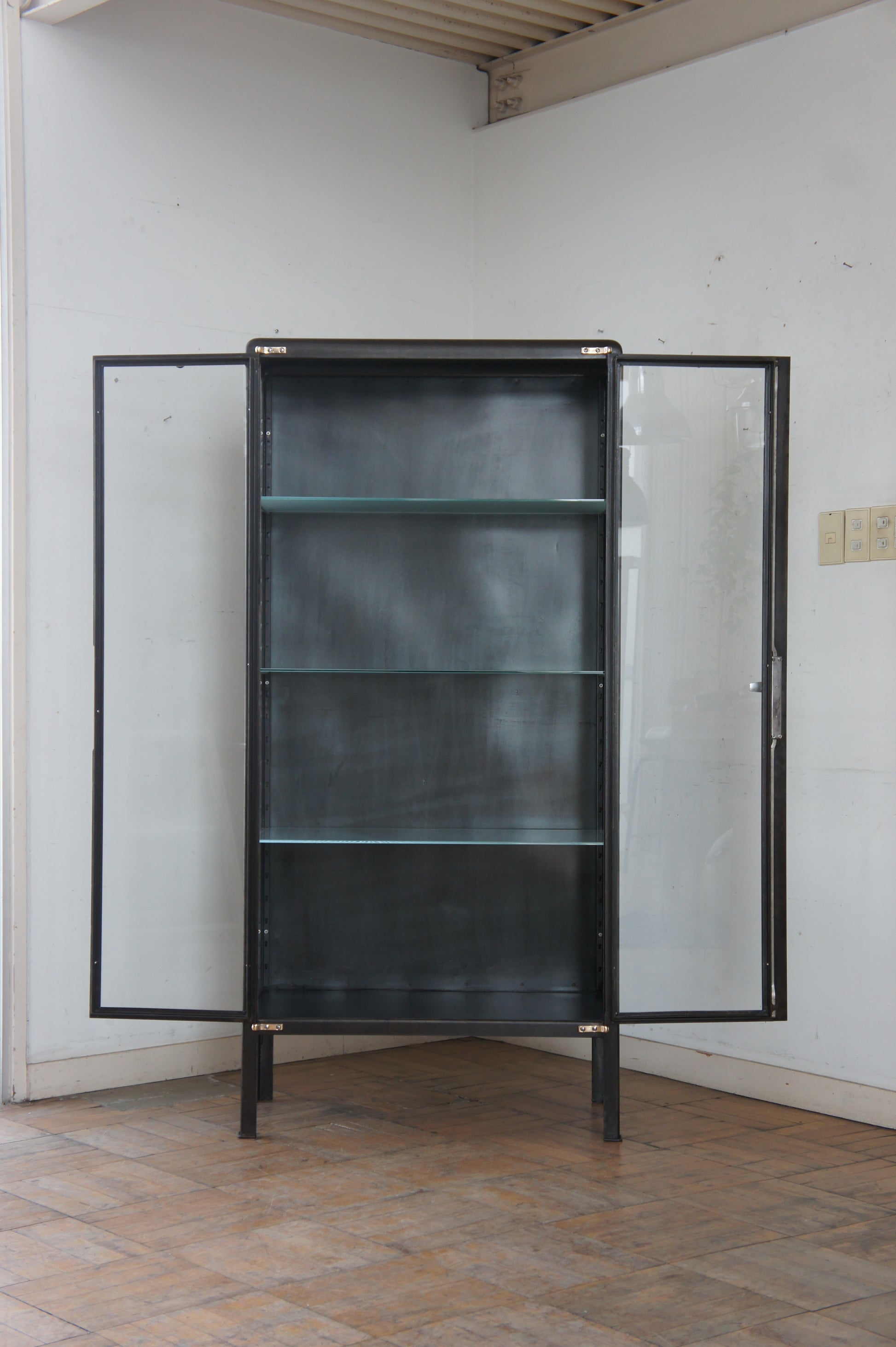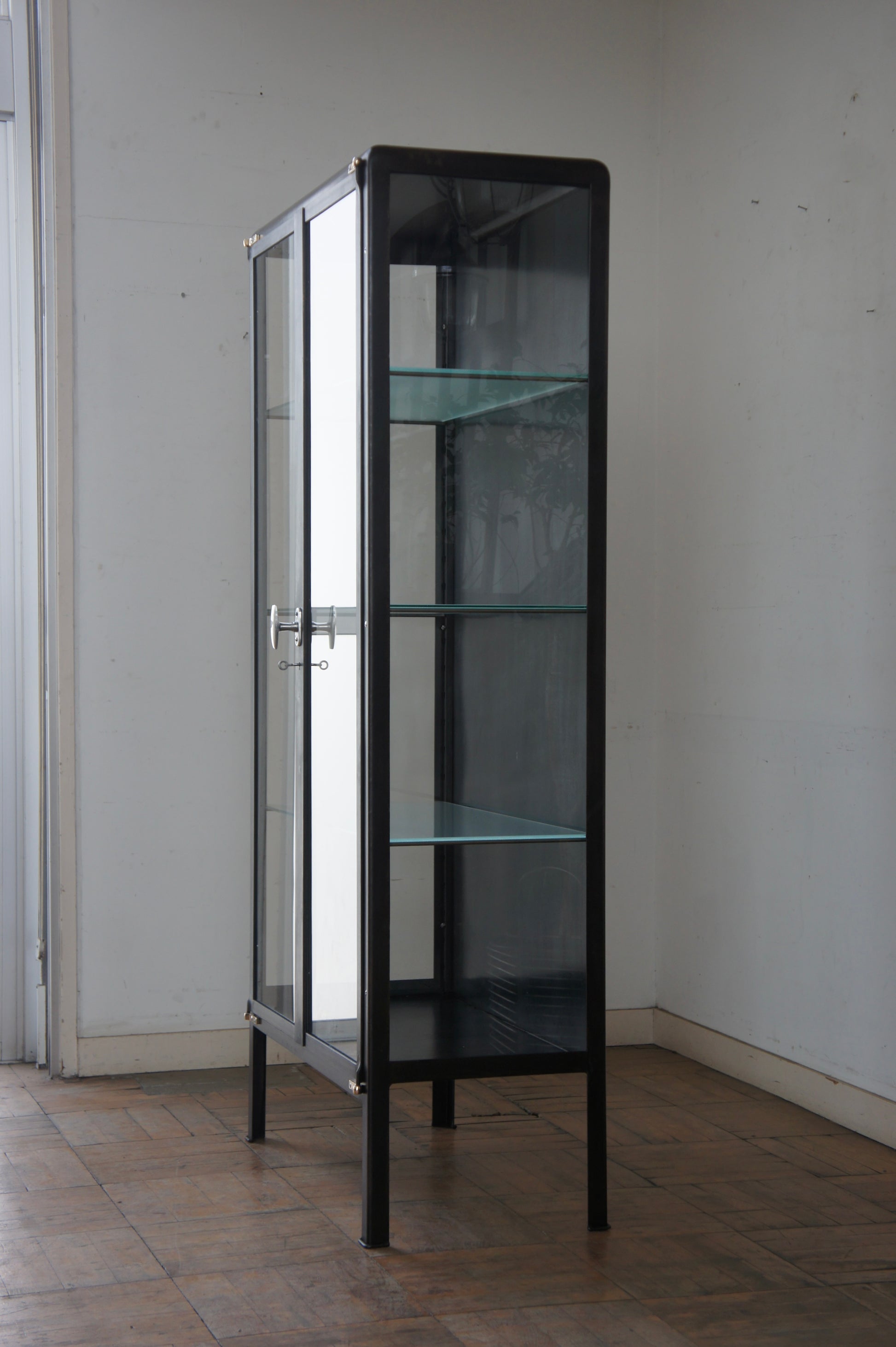 1950〜60年代頃のフランス製、医療施設や理化学機関などで実際に使用されていた、鉄製のガラスキャビネット。古い塗装を剥離し、黒鉄色の質感を生かしたマットな仕上がり。古すぎず、綺麗すぎず、時代の風合いを程よく残したバランスの良いコンディション。