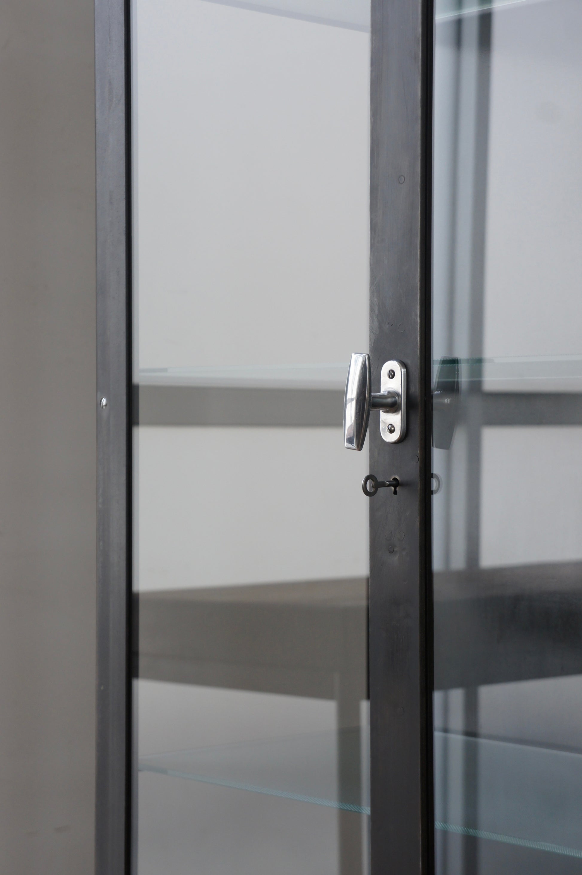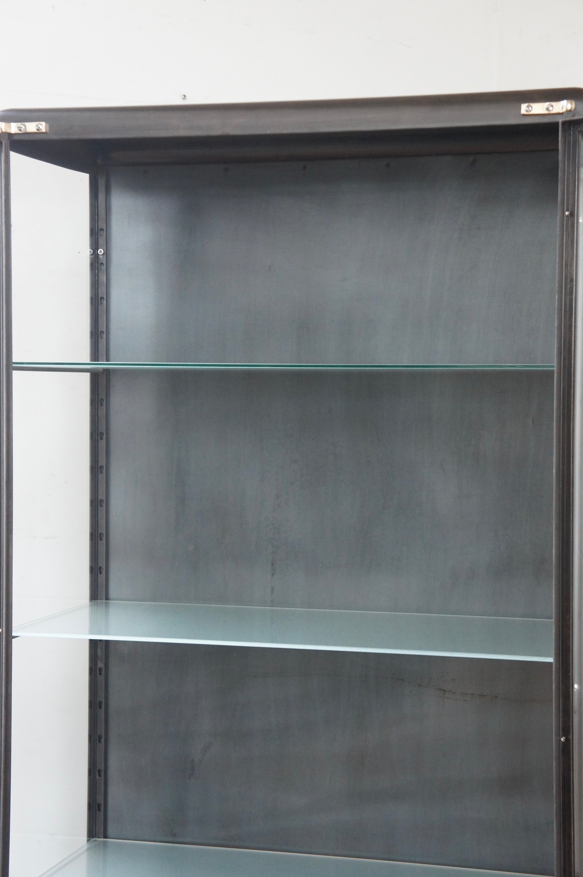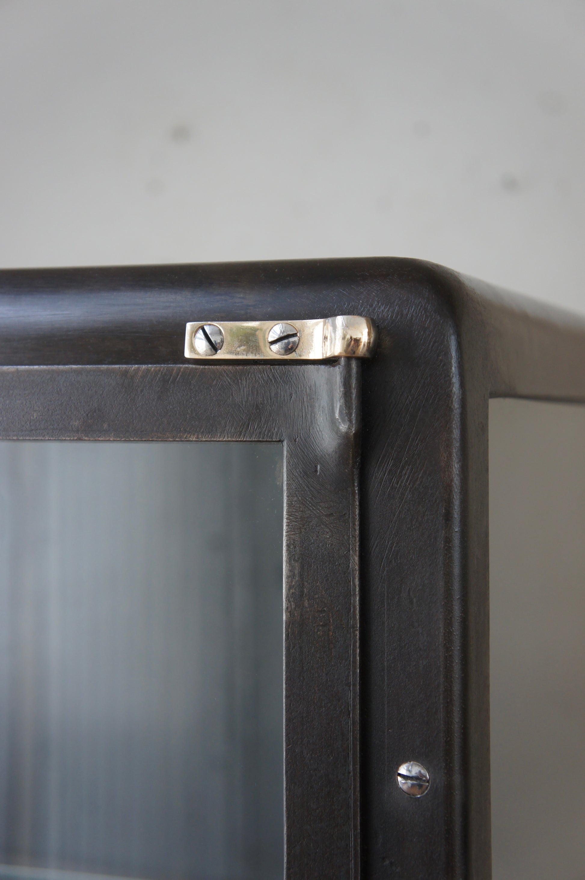 1950〜60年代頃のフランス製、医療施設や理化学機関などで実際に使用されていた、鉄製のガラスキャビネット。古い塗装を剥離し、黒鉄色の質感を生かしたマットな仕上がり。古すぎず、綺麗すぎず、時代の風合いを程よく残したバランスの良いコンディション。