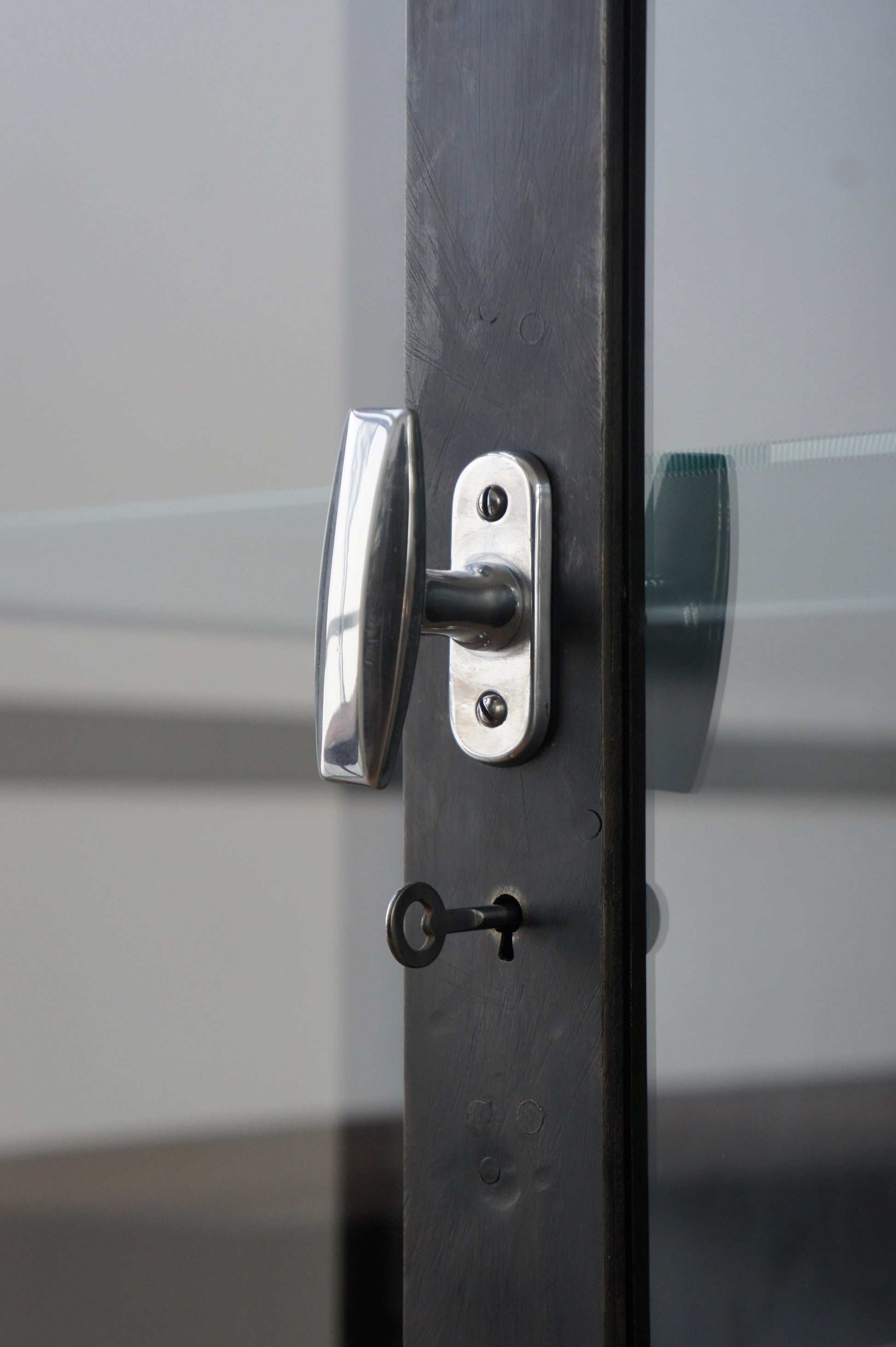 ドアはハンドル式で、開閉もスムーズ。実用的にお使いいただけます。鍵も付属しますが、古いもののため頻繁なご使用にはご注意ください。