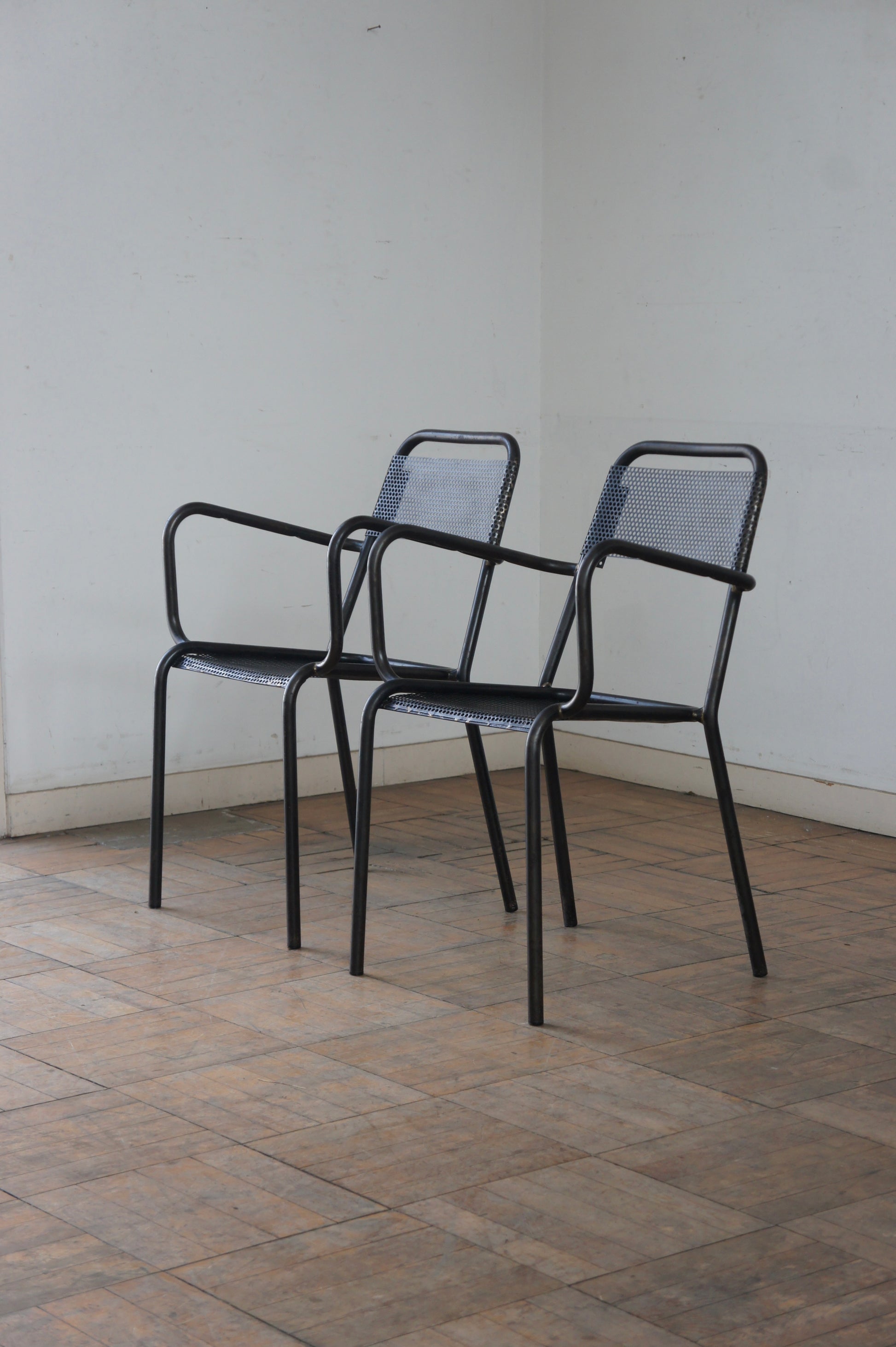 当時、多くの公共施設や学校などで使われていたパブリックチェア。頑丈で、快適で、そしてスタッキングができる合理的な設計。無駄を削ぎ落としたその姿には、フランスらしい機能美が宿ります。パンチングメタルは、もともと屋外での使用を想定し、水はけへの配慮から選ばれた仕様。雨を逃がすための機能が、そのまま美しさへと昇華されています。曲げ鋼管のフレームとの組み合わせが生む、クールさと抜け感。アームの内側に自然と身体が収まり、気づけば肘をあずけたくなる包容感があります。