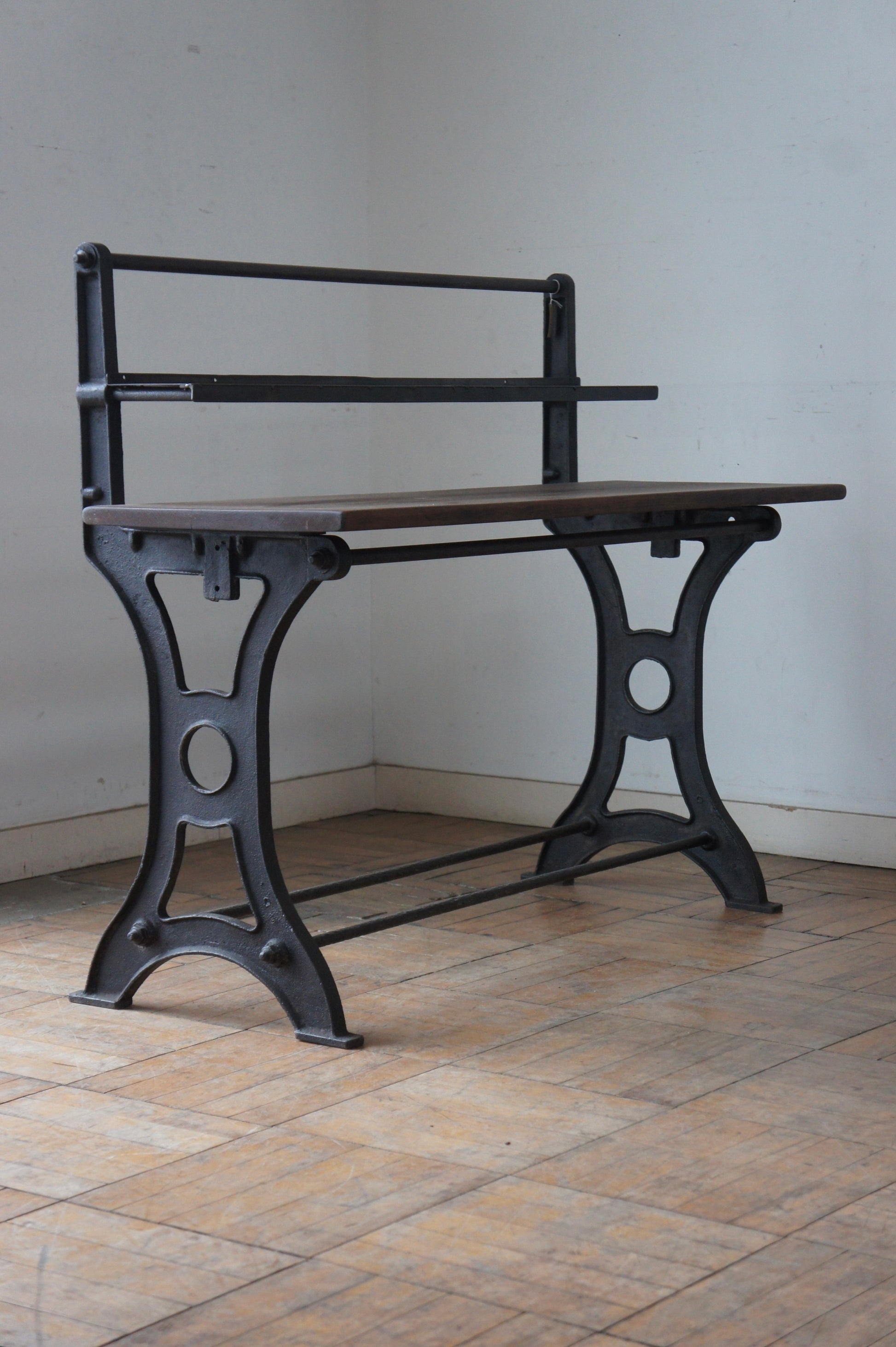 作業台としてはもちろん、ディスプレイ台や陳列什器として非常に扱いやすい高さバランスです。商品やオブジェを置いた際に視線が自然に落ち、空間に奥行きを生むプロポーションとなっています。上段には小さな鉄製の棚板を備え、道具や資料、ディスプレイのアクセントを添えることが可能。また、最上部の横方向のバーは、布や道具を掛けるための機能的な意匠として、機械由来の面影を残しています。