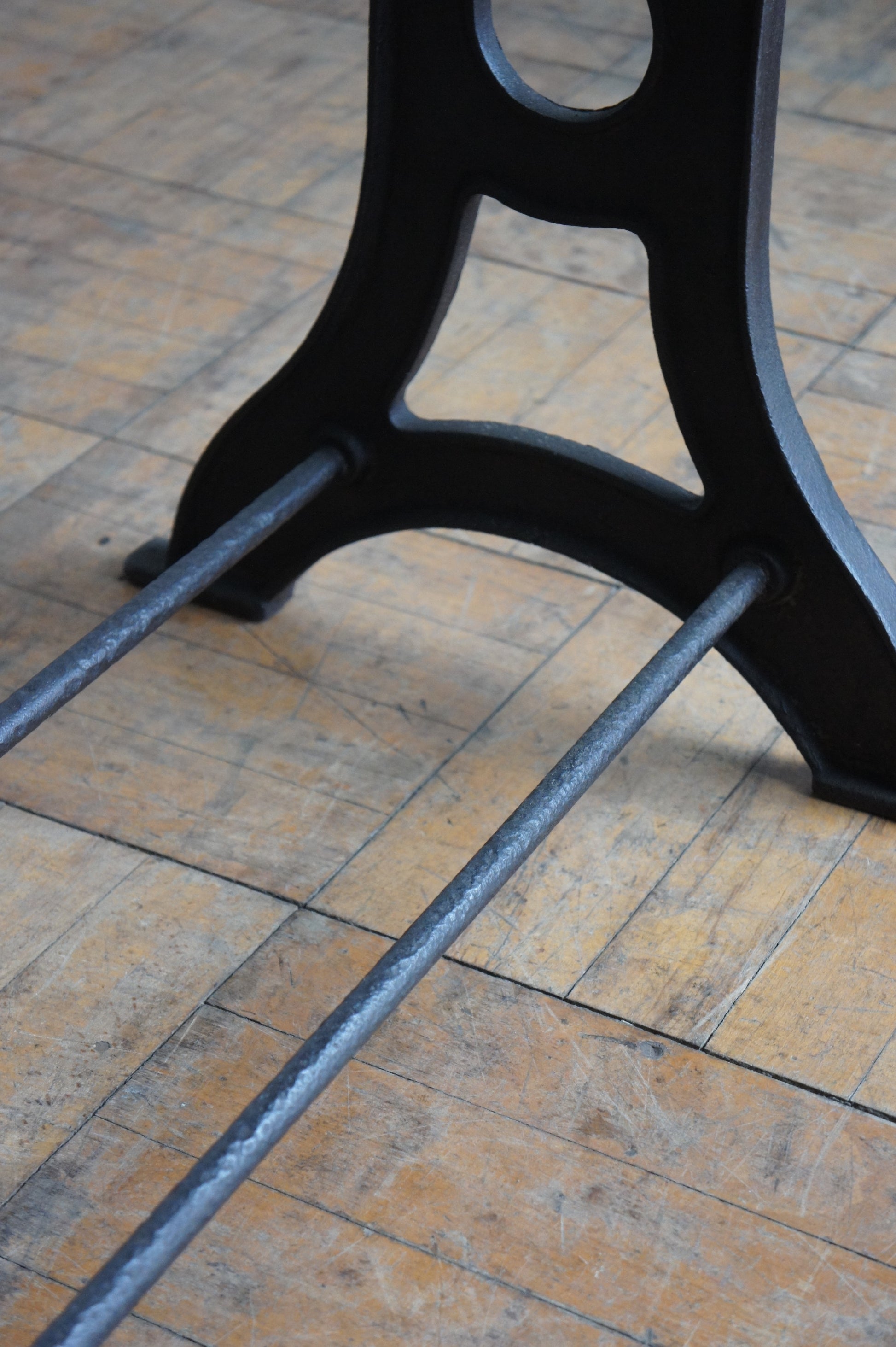 鋳鉄部分には経年使用による錆びや質感の変化が見られますが、構造的な不具合はなく、安定した状態です。木部には擦れや古材特有の痕跡がございますが、いずれも使用に支障のあるダメージはありません。素材の持つ時間の表情を活かすため、過度な補修や仕上げは行わず、必要最低限の調整に留めています。